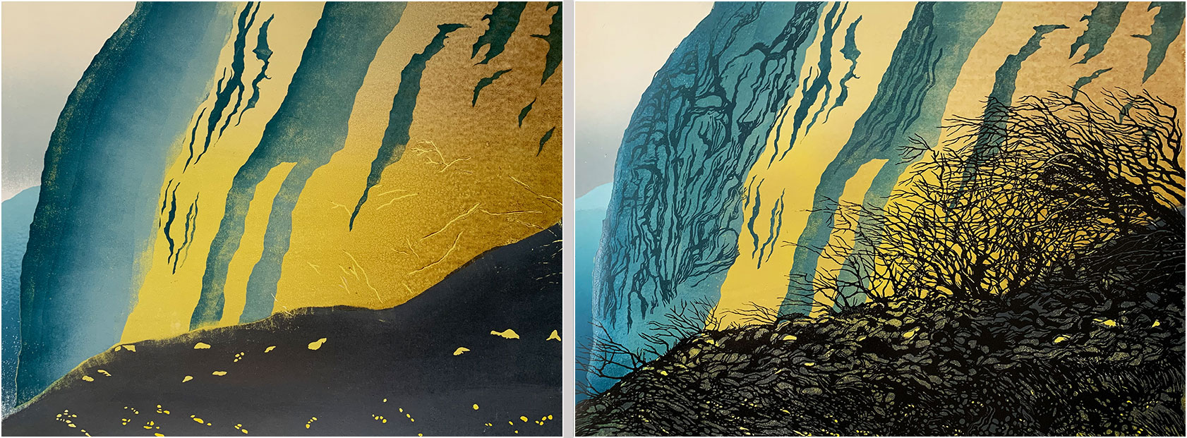 I felt there needed to be more tree action to the right of the previously-cut trees, and I wanted some more cliff detail in the centre of the print.