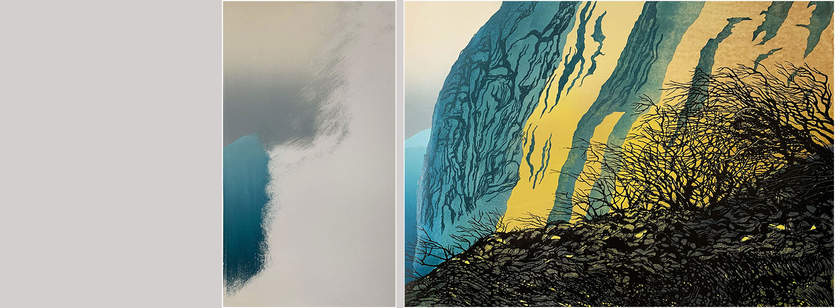 Next, the background block (that carried the yellow and grey, and the sky and distant cliff) is cut away, leaving only the sections shown here, which are inked in this photo and ready to print. Note that the inking is quite rough - I wanted to use the roller to create some additional cliff texture. I also had to estimate how the transparency of the blue would interact with the previously-printed yellow - I was expecting a blue/green, which is pretty much what I got.