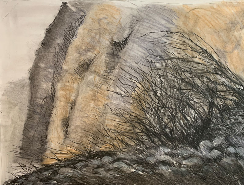 It wasn't the best weather to spend time on the beach drawing the scene (and I tend to take a lot of photographs of different views which I like to mull over at home before deciding which to progress with, so my camera is a bit of a necessity).