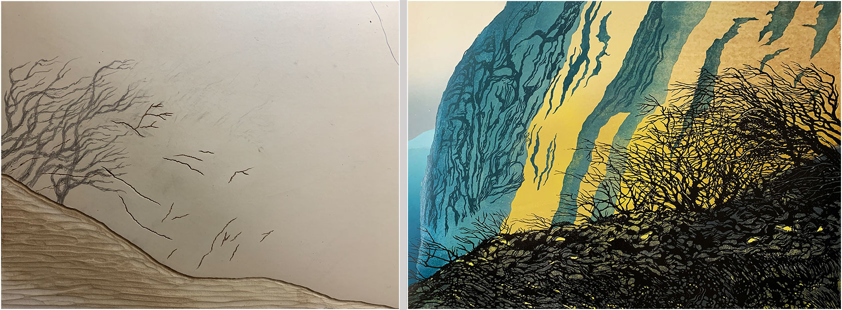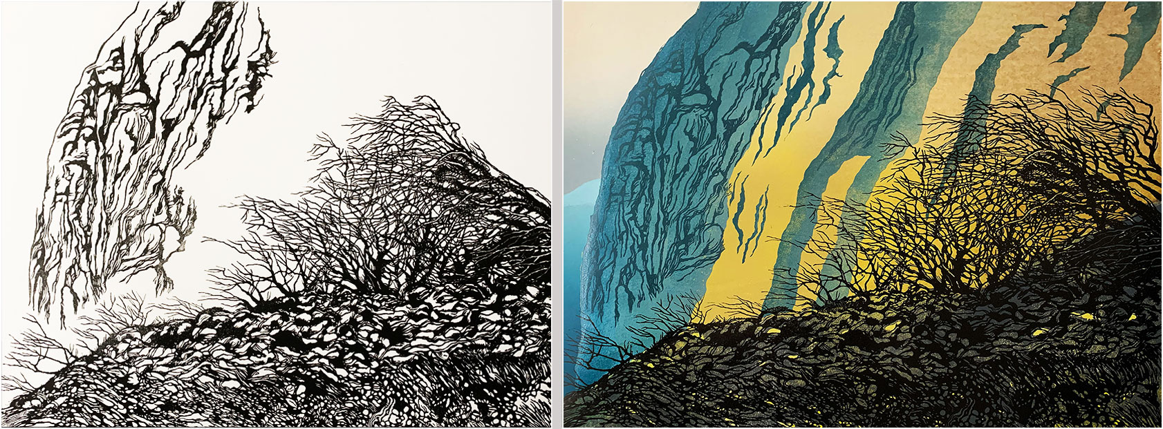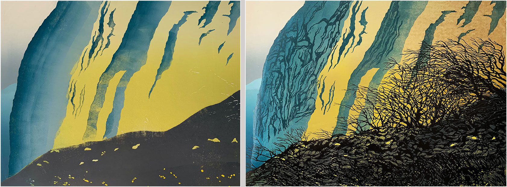 I felt there needed to be more tree action to the right of the previously-cut trees, and I wanted some more cliff detail in the centre of the print.