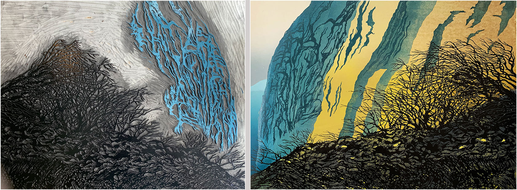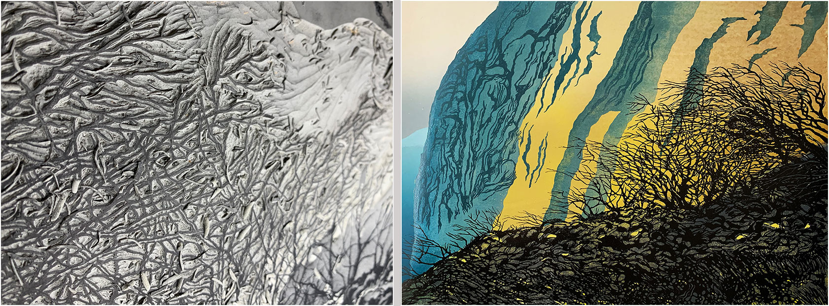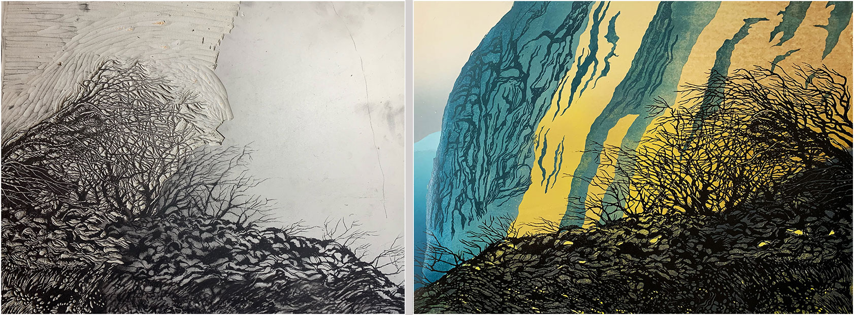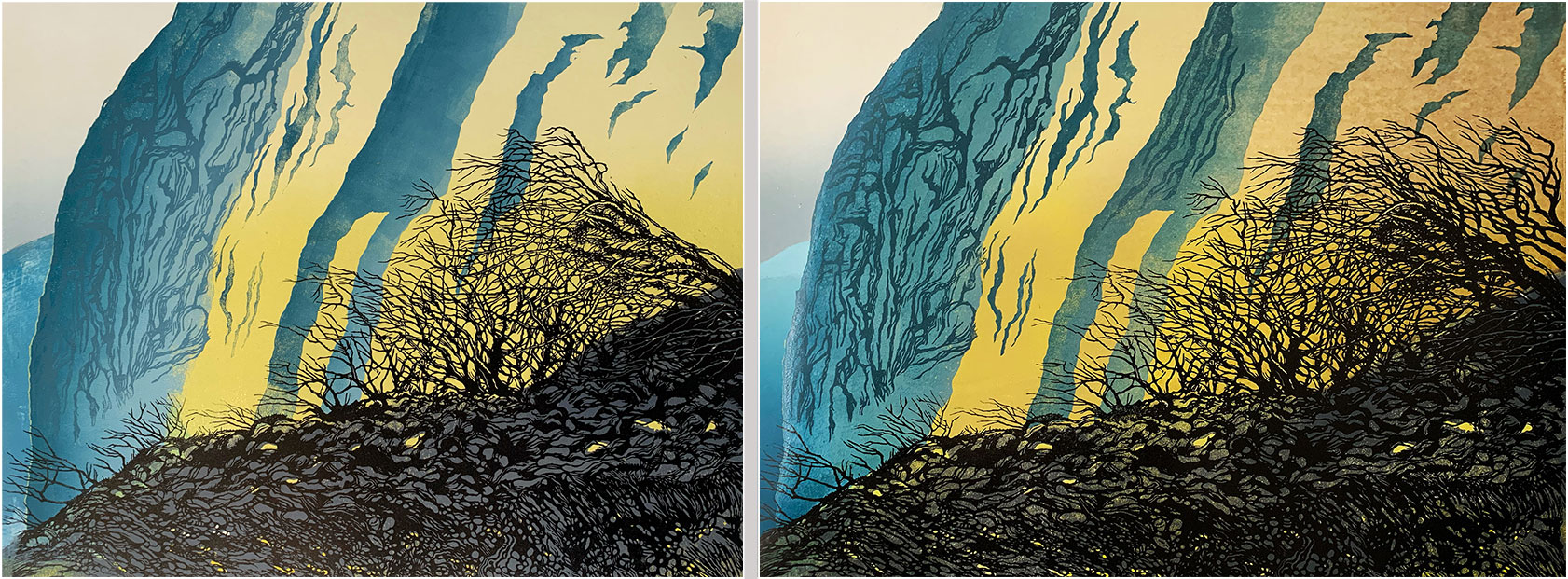 I felt there needed to be more tree action to the right of the previously-cut trees, and I wanted some more cliff detail in the centre of the print.