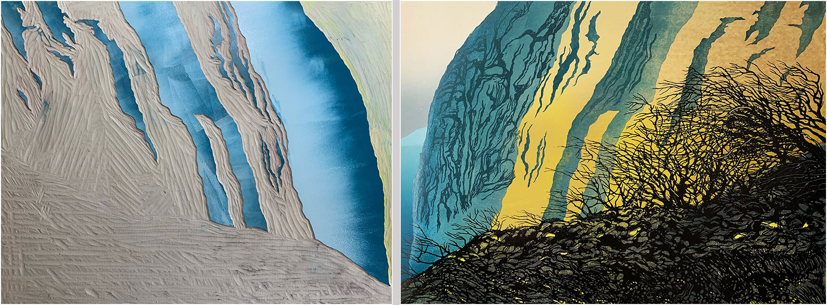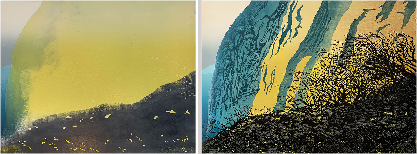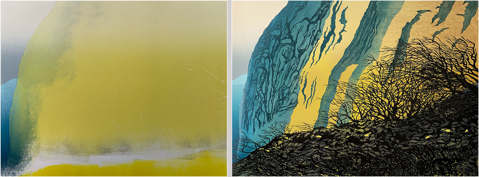 Next, the background block (that carried the yellow and grey, and the sky and distant cliff) is cut away, leaving only the sections shown here, which are inked in this photo and ready to print. Note that the inking is quite rough - I wanted to use the roller to create some additional cliff texture. I also had to estimate how the transparency of the blue would interact with the previously-printed yellow - I was expecting a blue/green, which is pretty much what I got.