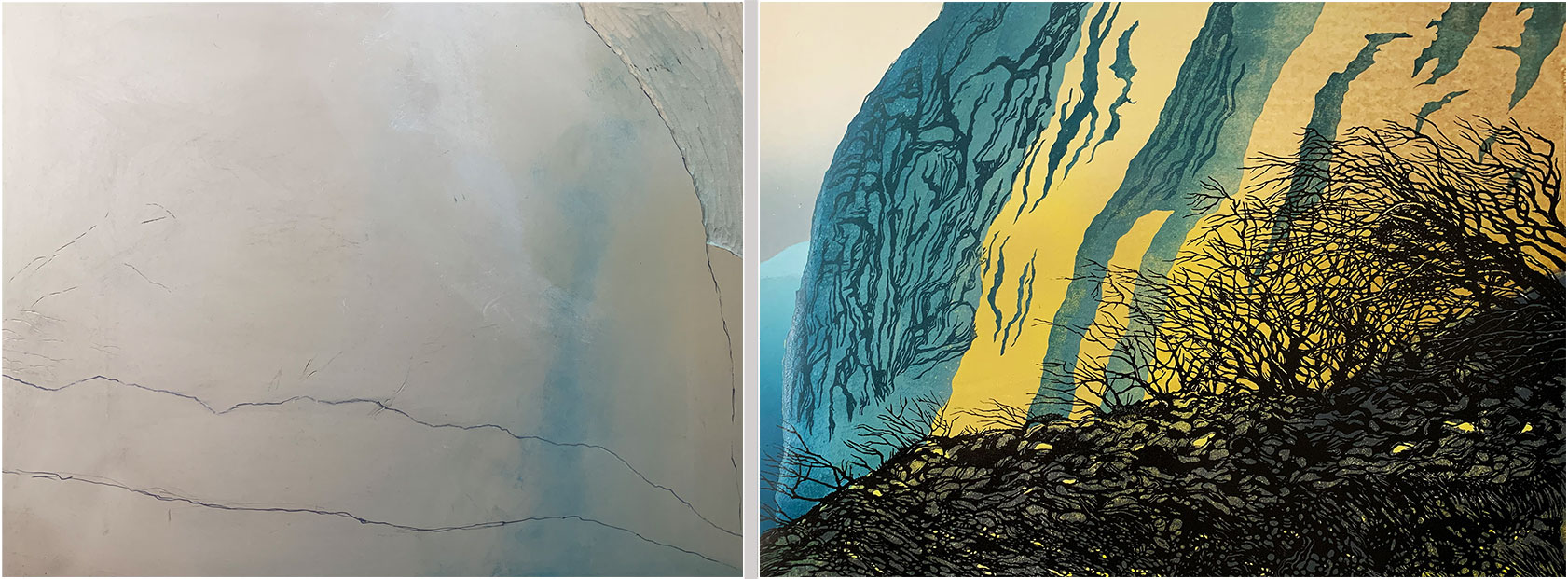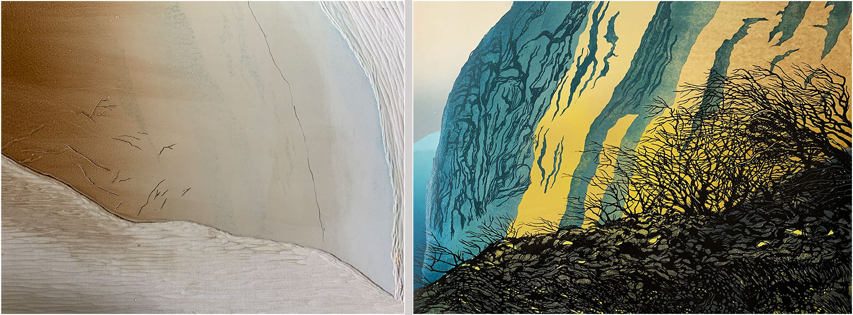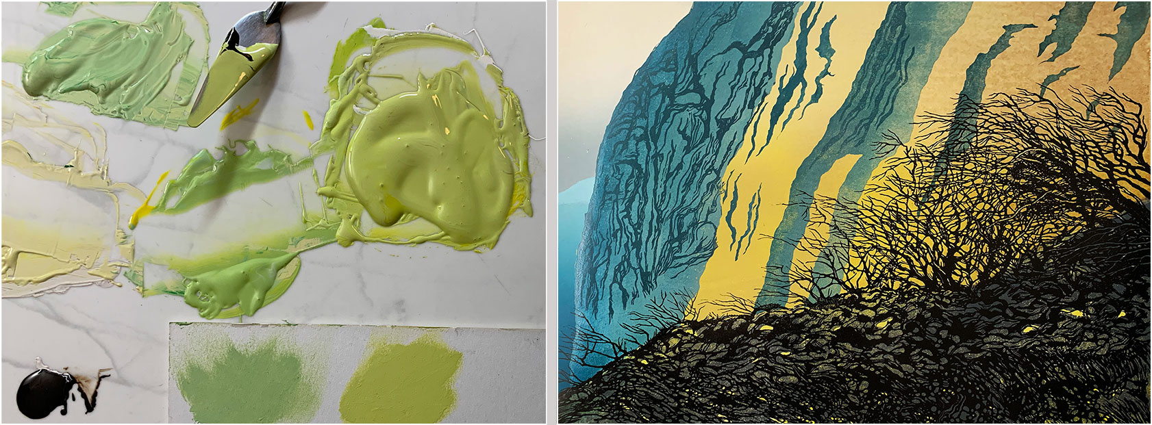 Next, the background block (that carried the yellow and grey, and the sky and distant cliff) is cut away, leaving only the sections shown here, which are inked in this photo and ready to print. Note that the inking is quite rough - I wanted to use the roller to create some additional cliff texture. I also had to estimate how the transparency of the blue would interact with the previously-printed yellow - I was expecting a blue/green, which is pretty much what I got.