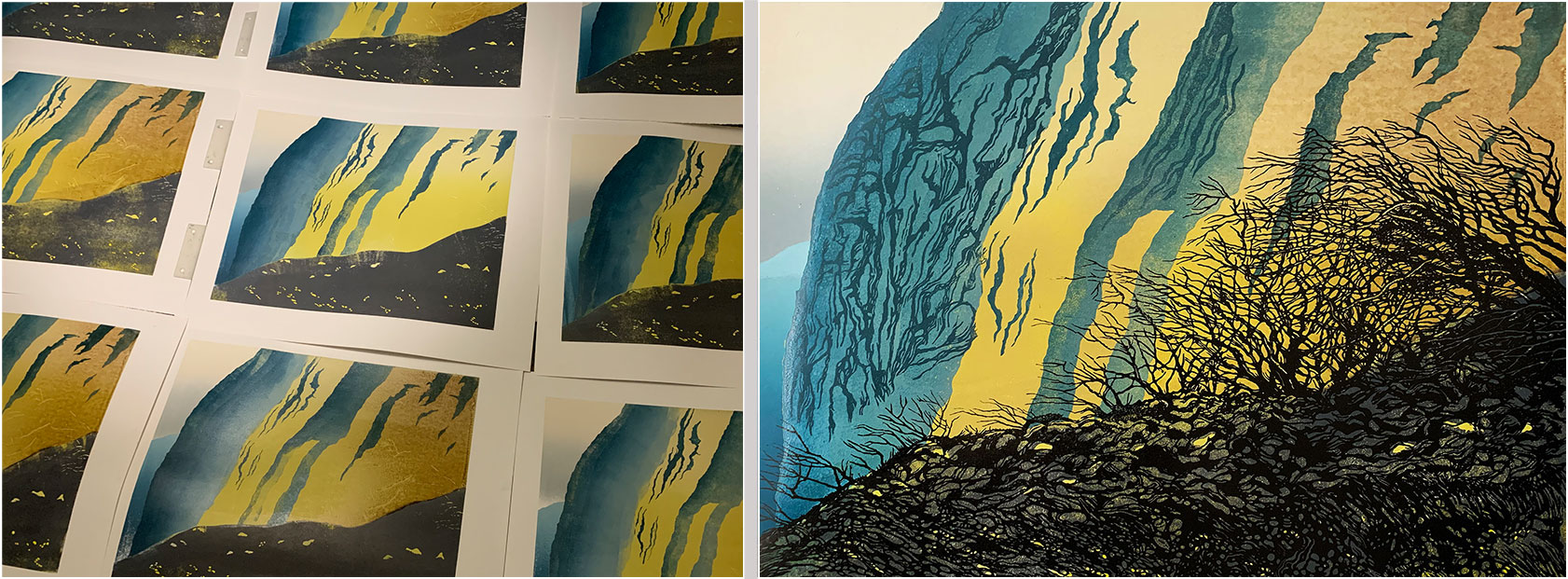 I need this grey to sit behind the foreground, but, as mentioned above, I also want some yellow to show through. To achieve this, I traced part of the foreground image (see 4, above), then I cut away the boulder/rock shapes that I want to show through as yellow. After that, I drew a line using indelible ink so I could see where the top edge of the grey had to sit, which enabled me to apply the ink using only a roller (rather than cutting away any of the lino). This had to be fairly precise so that the top edge of the grey would be hidden behind the subsequent printing of the foreground black.