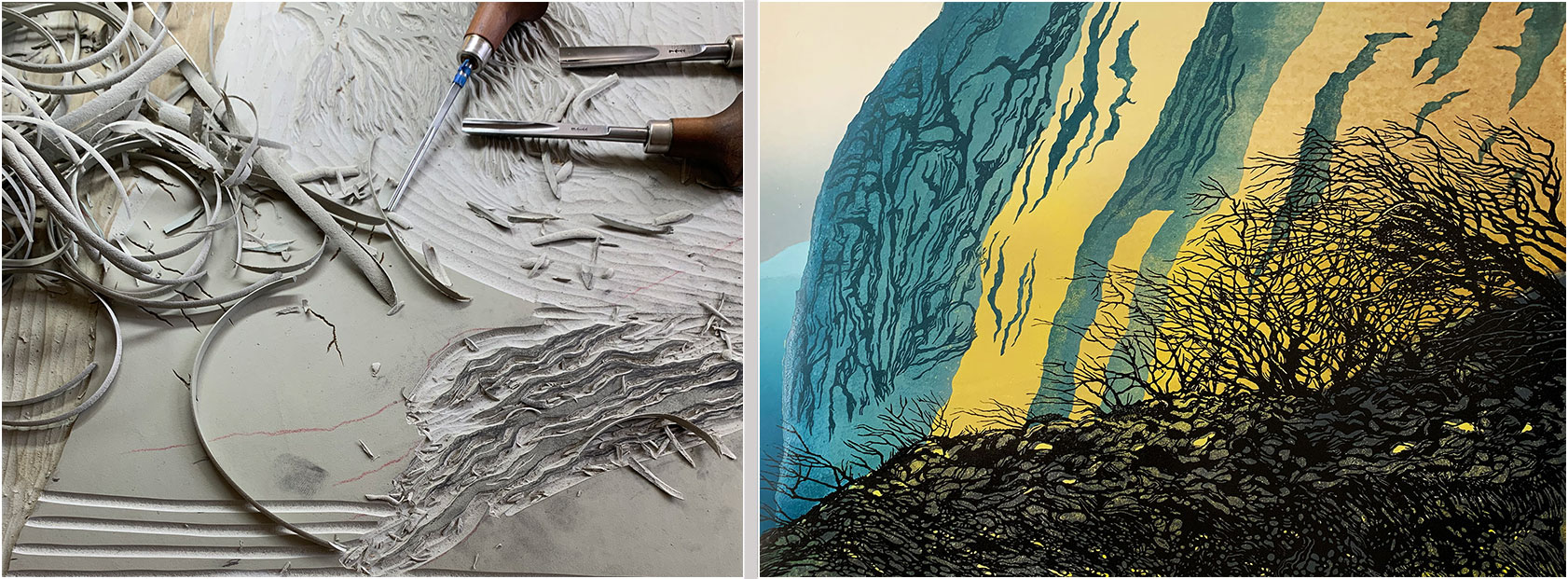 Here's a work-in-progress photo of that final block. All the trees and the cliff detail have been cut, and I'm clearing away the unwanted lino. Those big cuts at the bottom of the picture are a technique that makes it easier to clear away big areas of lino... the cuts you can see are fairly hard work, but they make the process of cutting the remaining strip a bit easier on the hand.